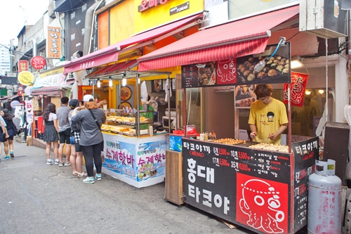 そんな弘大エリアも屋台は駅の出口を降りたところから屋台があり、メインストリートには屋台が集結しています。